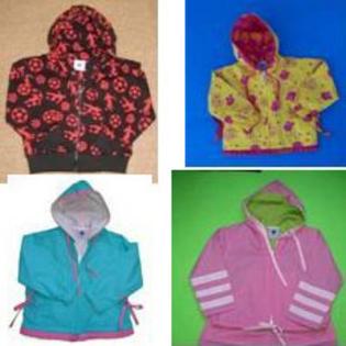 Description: The cotton knit and woven hooded jackets have a drawstring through the hood and waist. They were sold in sizes 12 months through size 10 in a variety of solid colors and prints. "Young Colors" is sewn into the jacket tag located at the neck.