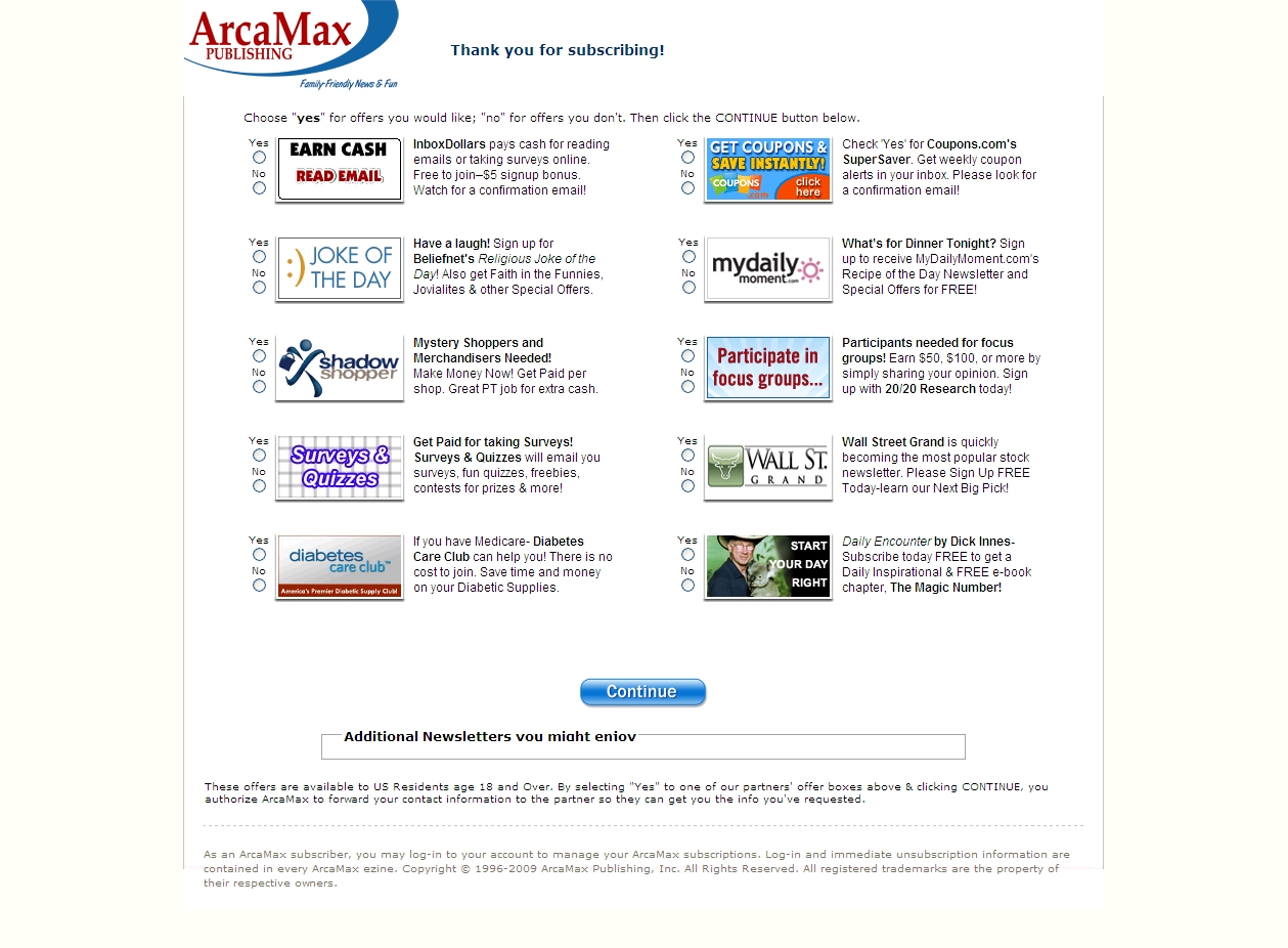 On an average day, 5,000 or more readers will confirm a subscription to one of our email newsletters (also known as "ezines"). With titles ranging from Humor (Daily Garfield, Baby Blues and Zits Cartoons, Daily Jokes) to Inspiration (Daily Bible Verses), to our latest category: a complete online library with the ArcaMax Book Club, ArcaMax Publishing truly offers something for everyone!