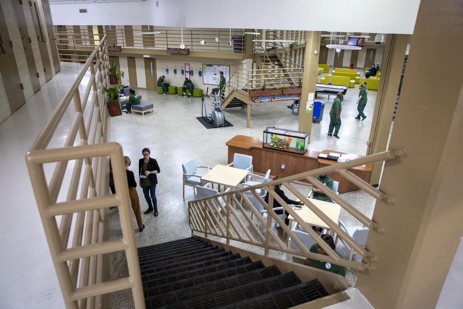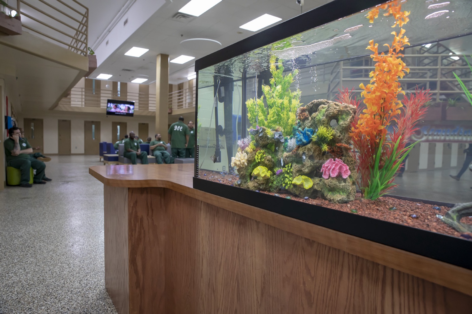 With single cells, a communal kitchen, Nordic-like furnishings and a landscaped, outdoor green space, Little Scandinavia looks unlike any other U.S. prison. Plants grow throughout the common areas. A large fish tank, maintained by staff and residents, is the centerpiece of an area designed to encourage people to gather.