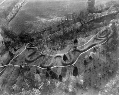 Serpent Mound lies 125 miles to the south of Newark. It is a nearly 1,400-foot-long effigy of a coiled serpent that also tracks the summer and winter solstice.