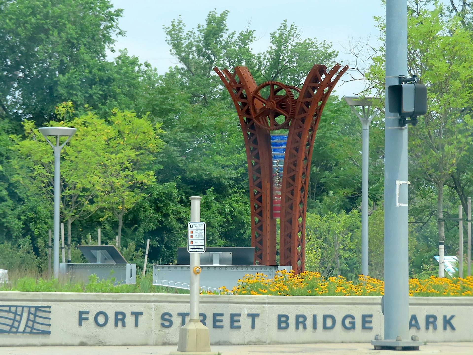 However, as you sit idling at the stoplight waiting to cross the bridge over the Rouge River, you might glance to the side and see something unexpected in this heavily industrialized area: A sculpture of weathered steel reaches toward the sky alongside a spray of flowers and waves of grasses and people fishing.