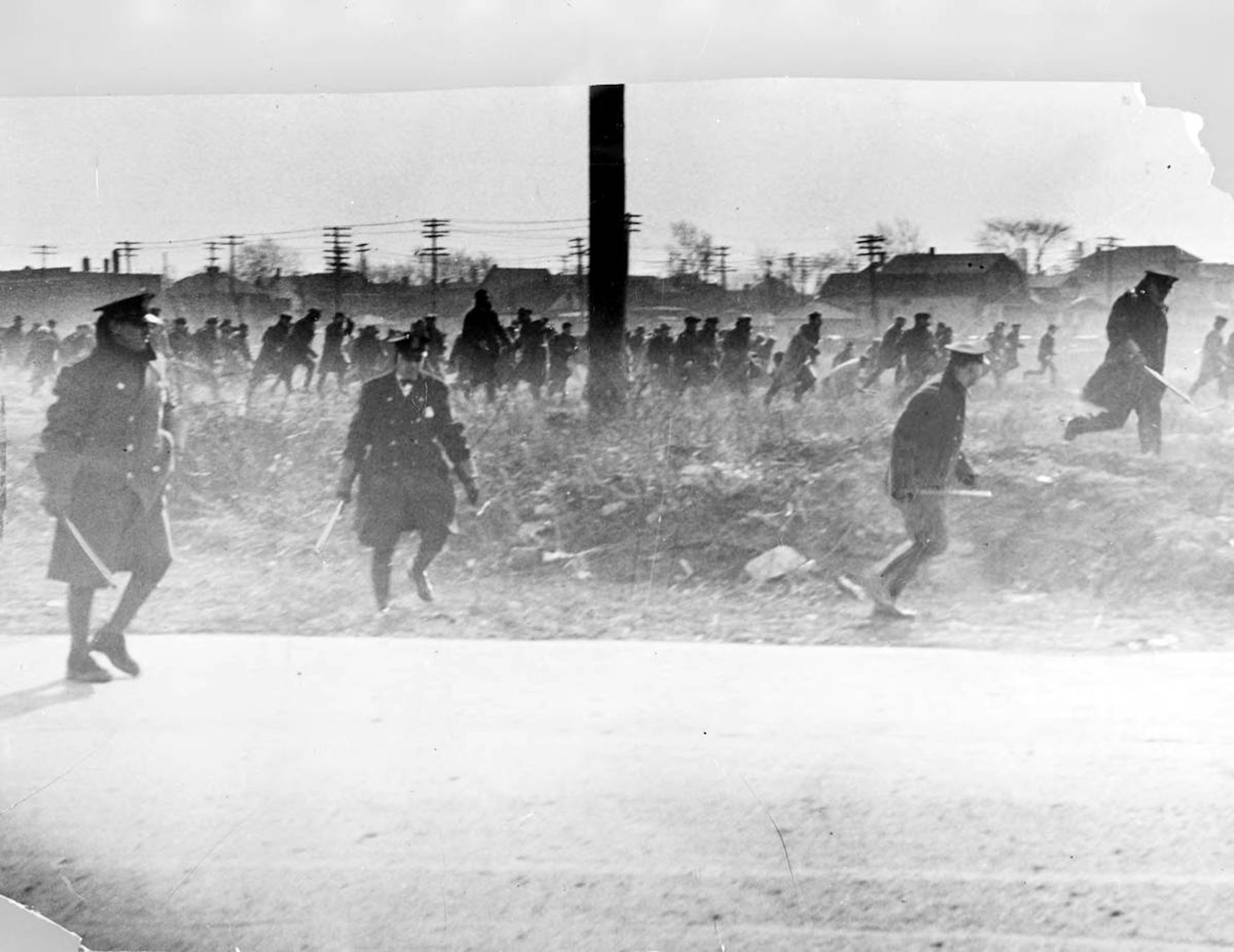 This crowd of several thousand marched up the road on one of the coldest days of winter. They were greeted at the Dearborn border with clouds of tear gas, jets of cold water and a shower of bullets.