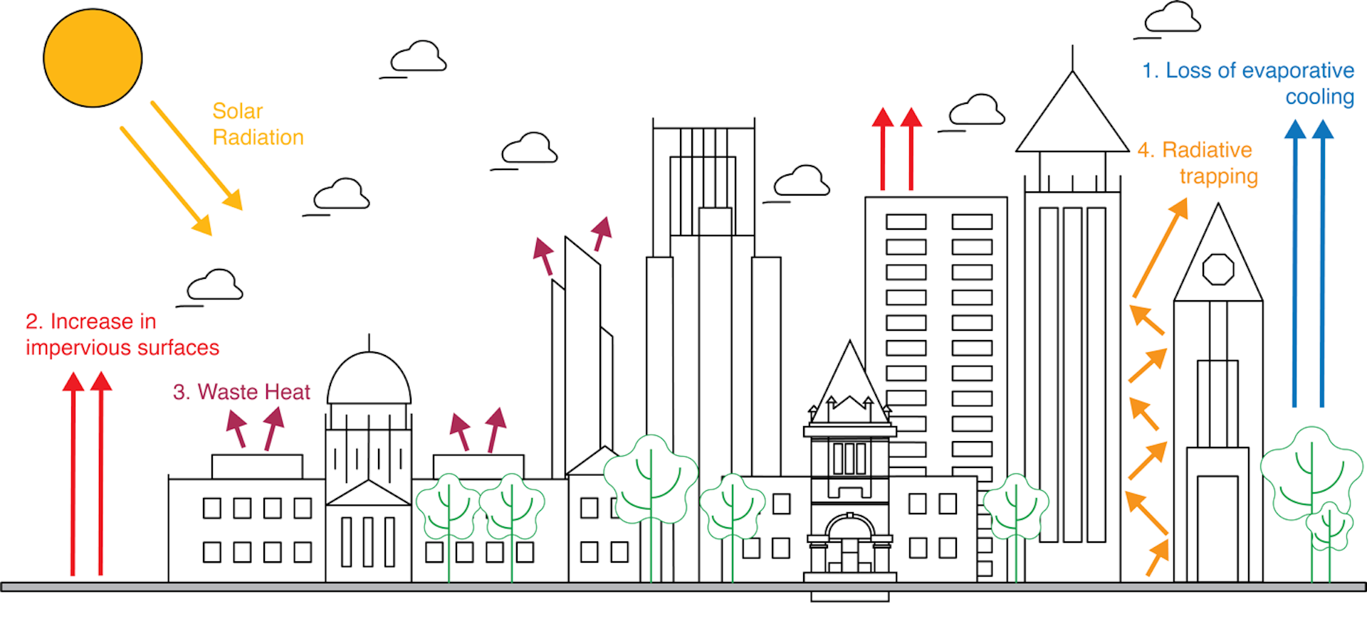 Absorbed solar energy is compounded by copious amounts of waste heat emitted from industrial processes, vehicle tailpipes and building air conditioning systems.
