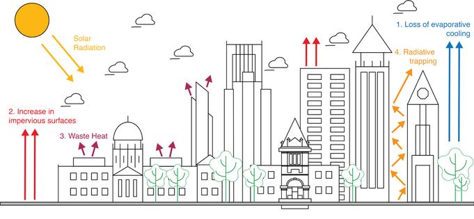 In zones of the city occupied by tall buildings, radiant energy released from streets and parking lots is trapped in the concrete canyons, further elevating temperatures.