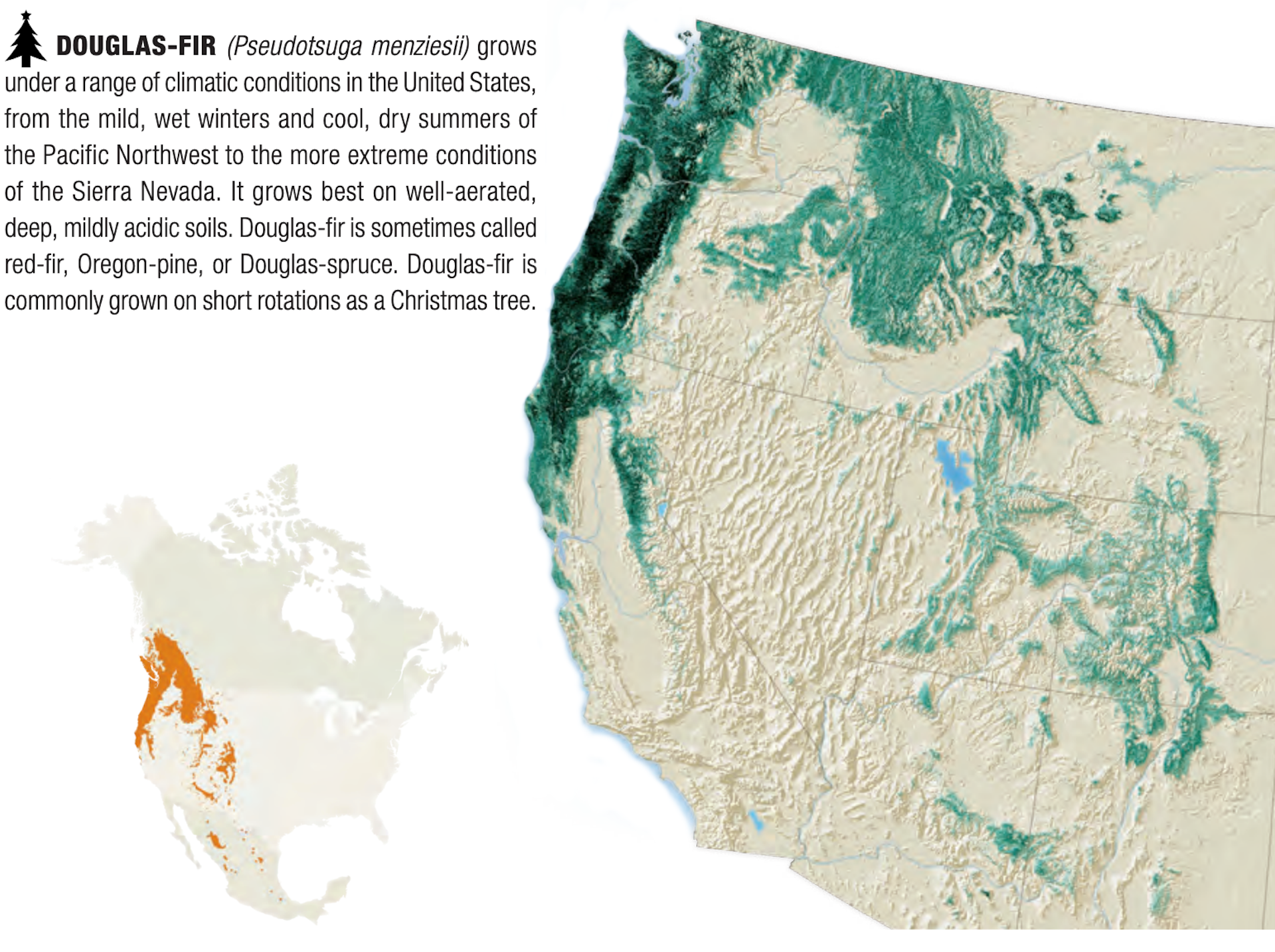 The most common Christmas tree varies by region: Douglas-fir is also common throughout the Mountain West. Scotch pine and balsam fir are regularly grown in the Great Lakes states. Fraser fir is also popular there but dominant in North Carolina. Leyland cypress and Virginia pine are common in the Southeast.