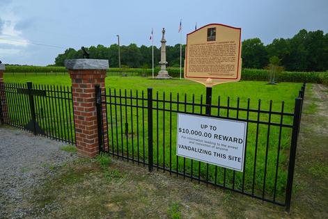“By 2020,” the marker reads, “historical monuments and memorials on public land were allowed to be vandalized and destroyed in many localities. It was decided by those who wanted to protect this monument that it should be taken out of government ownership and control.”