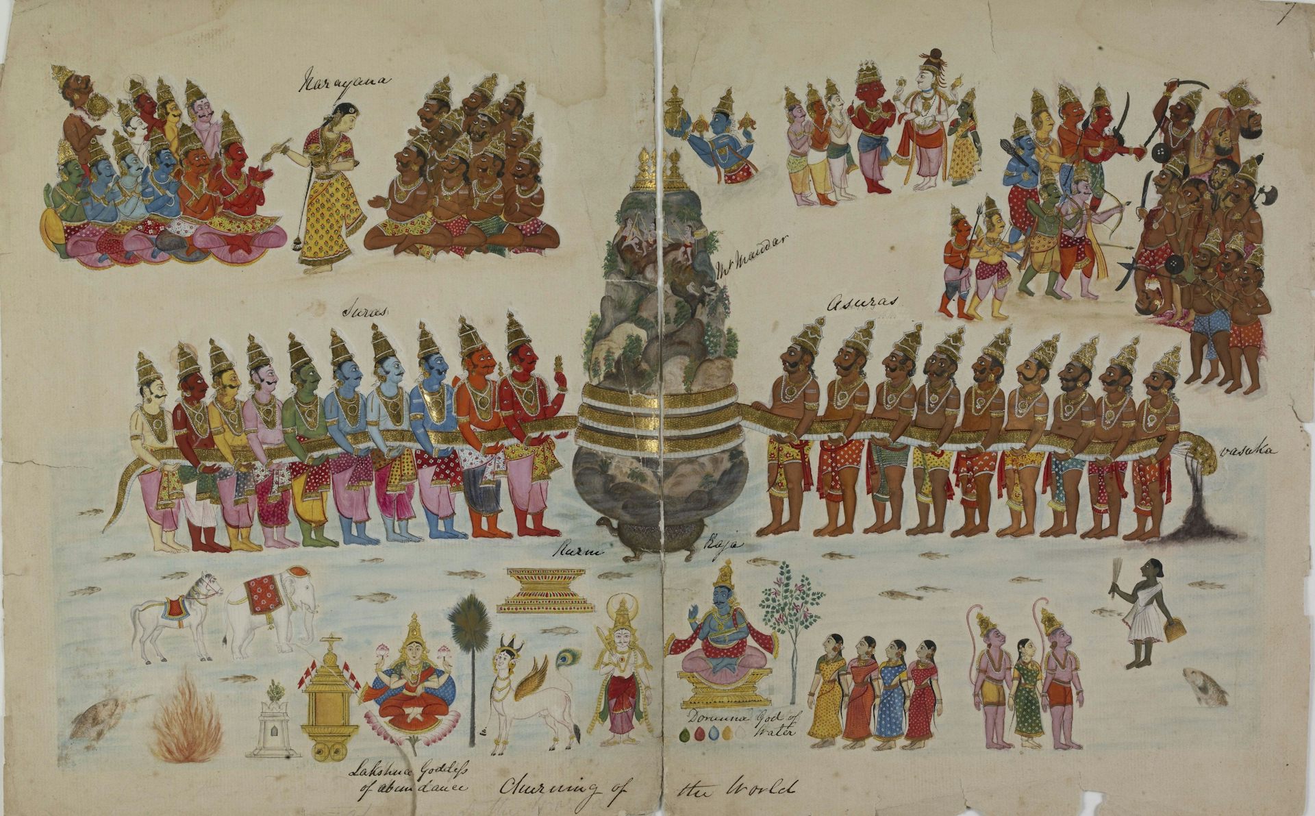 The cosmic ocean then was filled with milk, which they churned to draw out the nectar that would make them immortal. According to mythology, the asuras succeeded in the beginning, but their exertions disturbed Vasuki, the coiled, eternal snake at the Earth’s core, releasing a deadly poison that threatened to destroy the heavens. When the turn of the devas came, nectar was finally released from the depths of the netherworld. They drank the elixir and defeated the asuras.