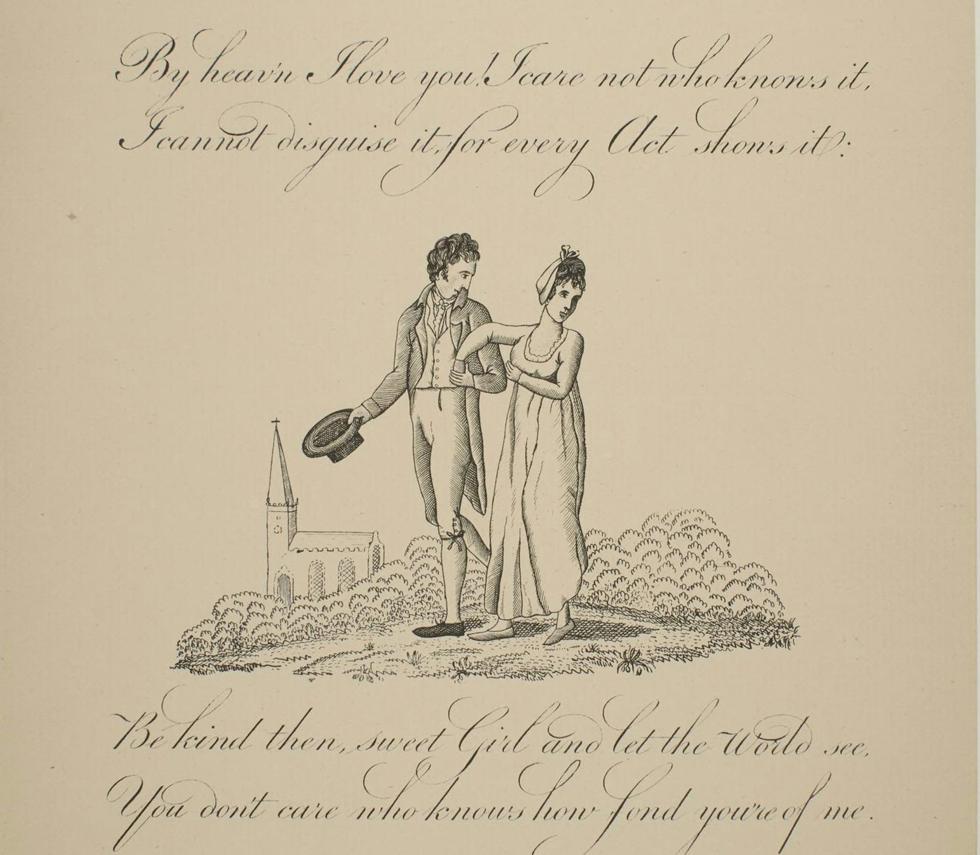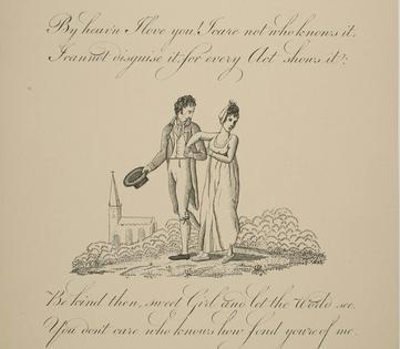 The British journalist and playwright Andrew Halliday was fascinated by these cards, especially one popular card that featured a lady and gentleman walking arm-in-arm up a pathway toward a church.