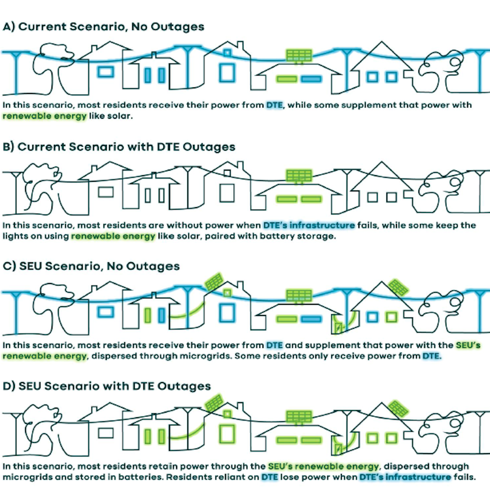 First, an SEU can function at almost any scale. A city like Ann Arbor can provide energy and services directly to homes and businesses that opt in and build out new distribution lines with each microgrid or community solar project. Only the residents who opt in pay for the service, allowing it to expand as more homes join.