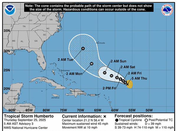 As of the NHC’s 5 a.m. advisory Thursday, the center of the storm was located about 480 miles east-northeast of the Caribbean’s northern Leeward Islands with maximum sustained winds of 45 mph moving northwest at 10 mph.