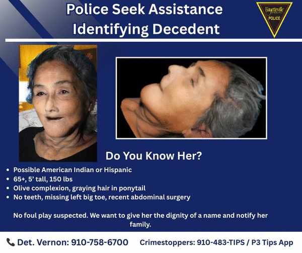Anyone with information is asked to contact Det. Holly Vernon with the Fayetteville Police Department at 910-758-6700.