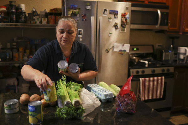 But at home, her kitchen shelves are often empty: Once a month after work, she leaves Lowell and visits a food pantry down the block. Bundled in layers on a recent afternoon, she walked home with four bags of produce and canned goods.