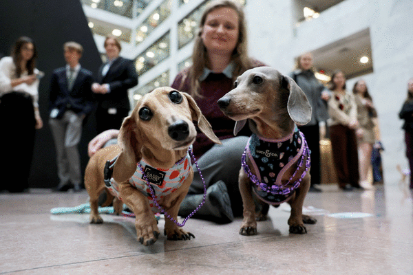 “Even in this world, where we are so serious about so many things, isn’t it nice to just kind of have a smile on your face and a dog all dressed up? That’s why we’re doing this,” Tillis said to the gathered crowd on Wednesday, speaking through a megaphone and rocking Mardi Gras beads.
