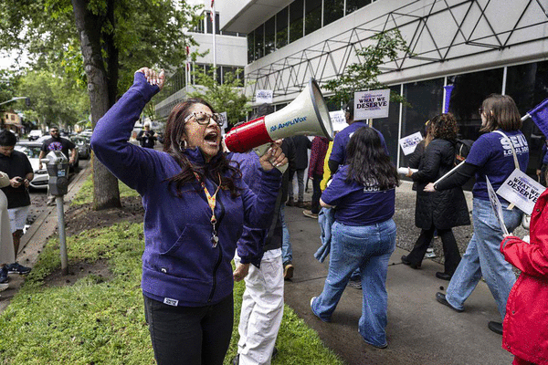 On Wednesday, the state workers again vocalized their opposition to the governor’s telework policy during a march from the Capitol grounds to the headquarters of the California Department of Human Resources, leaders of which met with SEIU Local 1000’s bargaining team this week to begin negotiations for a new contract.