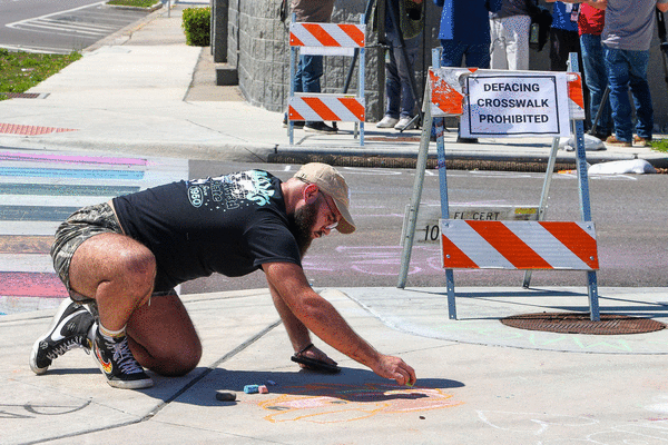 Demonstrators began chalking the crosswalk on South Orange Avenue and Esther Street in multiple colors shortly after the Florida Department of Transportation removed its rainbow-colored design in August with no advance notice.