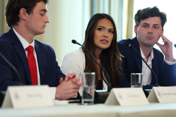 Video from musician Oskar Quentin showed people blowing whistles and horns close to Hernandez’s face as she walked away, brushing them aside with her hand. Paige Ostroushko blew a whistle full blast inches from Hernandez’s left ear, prompting a grimace from the Turning Point commentator.
