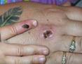 Mpox produces smallpox-like skin lesions, but symptoms are usually milder than those of smallpox. Flu-like symptoms are common initially, ranging from fever and headache to shortness of breath. One to 10 days later, a rash can appear on the extremities, head or torso that eventually turns into blisters filled with pus. Overall, symptoms usually last two to four weeks, while skin lesions usually scab over in 14 to 21 days.