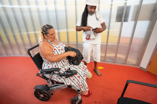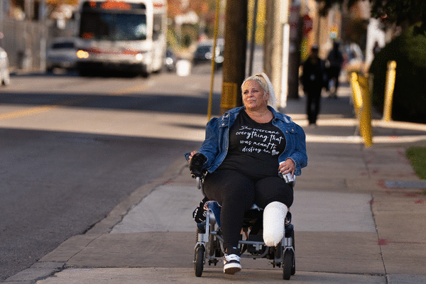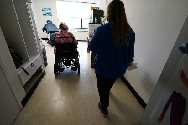 Wyatt was living there and undergoing treatment a month later, in August 2024, when she wheeled her motorized wheelchair into a clinic room and took deep breaths as nurses carefully peeled back layers of moisturized gauze on her left leg, cleaning the wound.