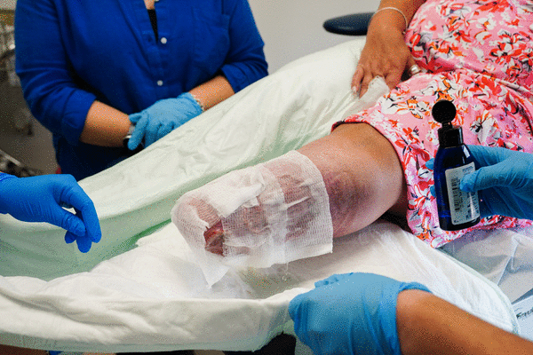At a recent appointment, nurse practitioner Danielle Curran scraped away infected skin, measured the wounds, cleaned and re-bandaged her lesion.