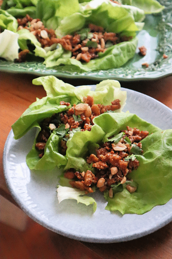 Add heaping spoonfuls of tofu mixture to the center of each lettuce leaf. Top with cilantro leaves, peanuts and a squeeze of lime before serving.