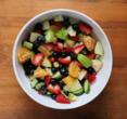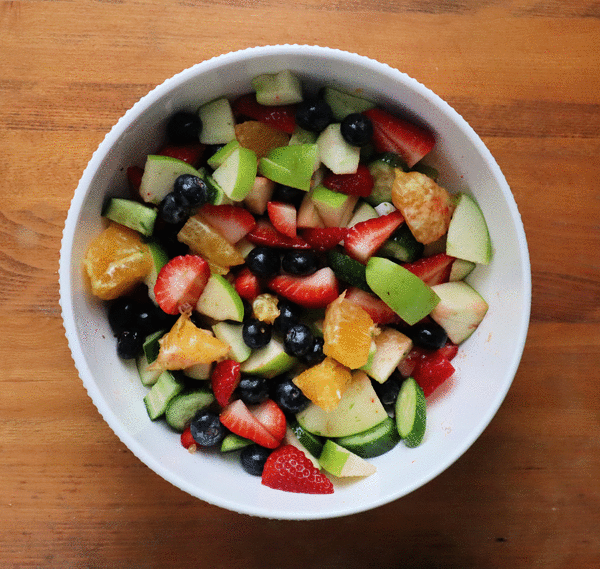 Slice the whole orange into wedges, removing the peel and allowing any orange juice to coat the apple and cucumber pieces. Add berries and stir gently to combine.