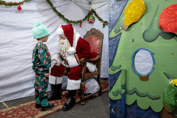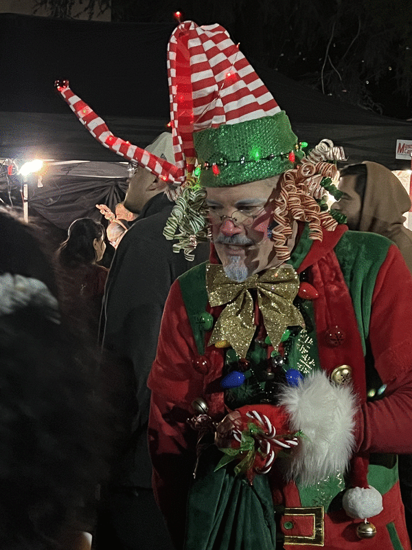 Community support is what motivated Wrinkle Jingle Jangle, aka Mark Chatham, to wander the festival in dazzling elf regalia, passing out small gifts to children. He lives in Pasadena, but he has several friends in Altadena, three of whom "lost everything" in the fire, "so I felt it was especially necessary to attend the lighting this year, to connect with and show my support for a community that has lost so much," he wrote in a text Sunday morning since he was mostly mobbed during the event.