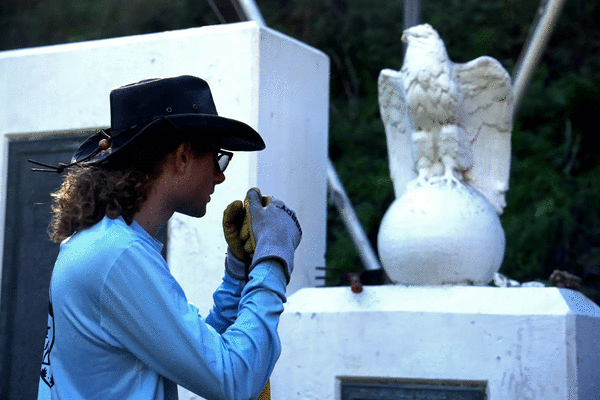 At lunchtime, Copen admired the work his group had accomplished. Large piles of ripped-out invasive plants dotted the campground; the sunlight finally hit the memorial’s foundation, which the adults there noted they hadn’t seen in decades.