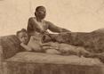 Titled African American girl nude, reclining on couch, the sepia image focuses on a young child gazing directly at the camera, one small arm tucked awkwardly under her chin as she leans back on a patterned couch, her chest exposed. It was one of many graphic photographs that Eakins, a realist painter, took of nude subjects — children included — as references for his work. In this instance, he posed the child as an odalisque, a figure in art history who’s typically enslaved into sex work.