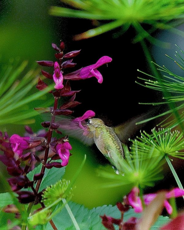 Catching an eastern tiger swallowtail feeding on the nectar of flowers below while the Queen Tut's tufts of foliage above creates a memorable moment. But having a Rockin Fuchsia salvia blooming up among the Queen Tut tufts opens the door to see the acrobatic wonder of a ruby-throated hummingbird going for its happy meal.