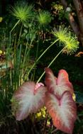 Though I have only used them in containers I can see how they will have an equally architectural look in beds too. The stems sturdily position themselves with their spider-like tufts mimicking miniature palms. But never underestimate their talent for bending ever so slightly toward colorful foliage or flowers to create a living piece of art. Such was the case of where I caught one bowing to the new Heart to Heart Crème Brulee caladiums.