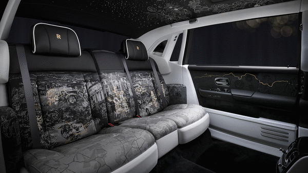 Envisaged to honor the Phantom’s 100th anniversary, interior scenes honor notable clients who have traveled within one. Developed in collaboration with a fashion atelier, the rear seats wear high-resolution printed fabric bearing 160,000 stitches. Up front, laser-etched seats depict hand-sketched linework. Woodwork boasts 3D marquetry, ink layering and 24-carat gold leafing. The dash art gallery reflects pages of a book with abstract text formed in aluminum.