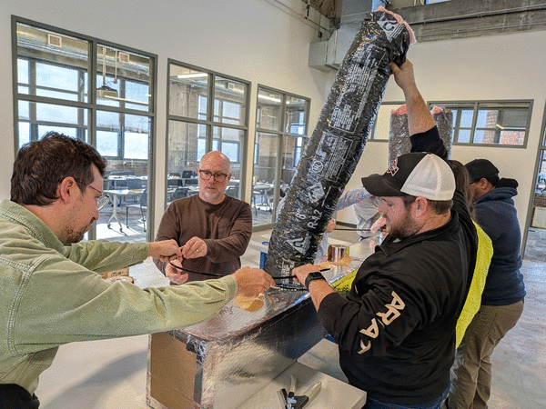 With a knife, he demonstrated how to cut through the insulation layer, stopping short of the aluminum cover — "like filleting a fish" — and how to fold the sheet into a rectangular duct, attach it to other ducts, and seal it with staples, zip ties and pressure-activated tape.