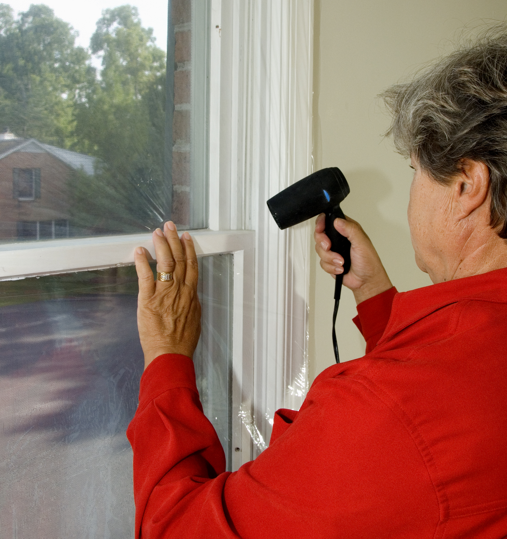 Window insulation kits, sold in hardware stores and home centers, contain plastic sheeting and double-faced tape that you cut and install on the inside of the window. You measure the window and cut the sheeting, tape the sheeting to the window trim to cover the glass, and then install it using a hair dryer. The blast of hot air from the dryer creates a shrink-wrap covering that seals the window from inside by creating a clear, tight-fitting film. You also need a measuring tape, scissors, a utility knife and a stepladder.
