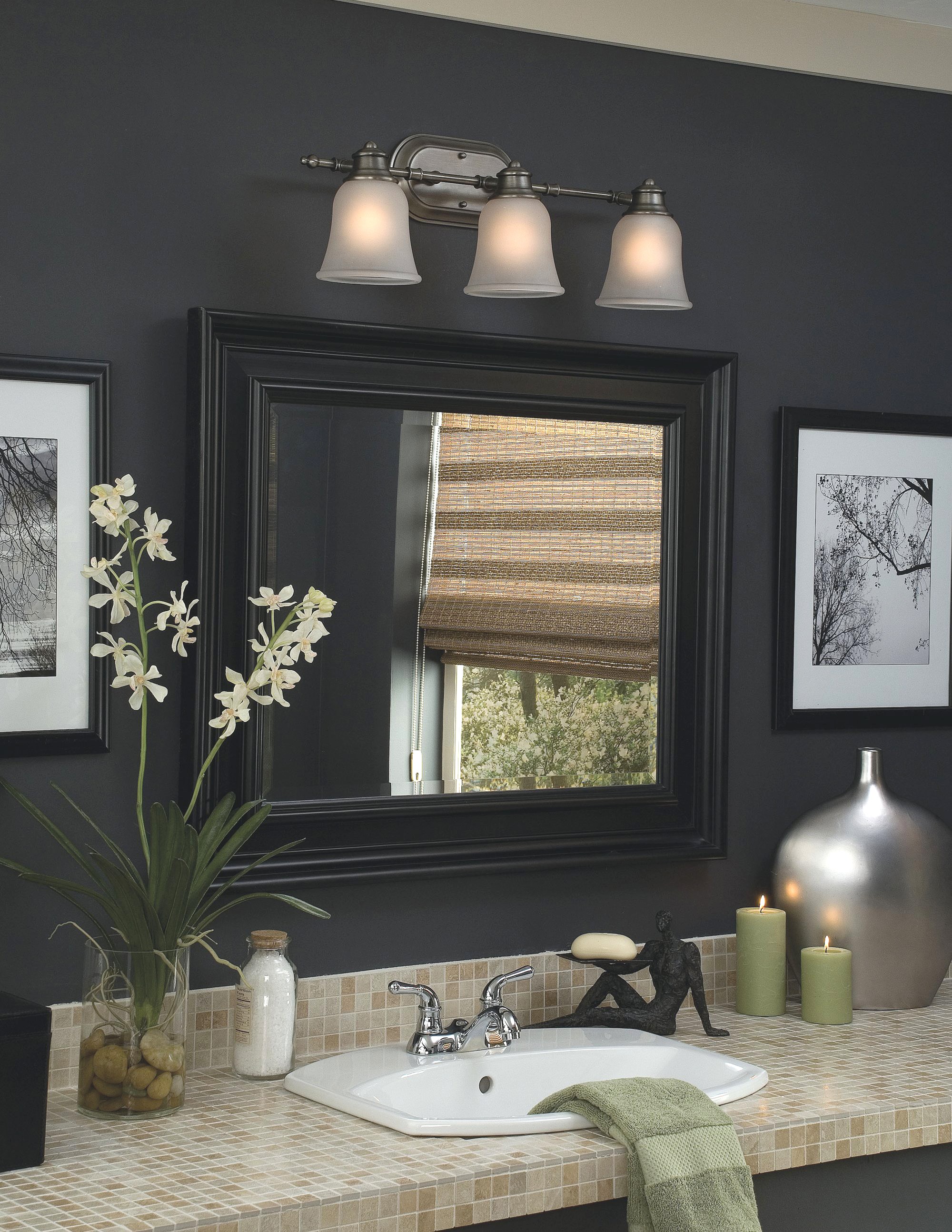 Take a walk down the aisles of the “Bathroom Lighting” section in any home or bath center and you’ll see a staggering selection of bathroom light bars designed for topping a mirror and vanity. Who knew replacing an ordinary bathroom light fixture could involve so many choices? You’ll find styles that complement any decor, from sleek contemporary chrome to textured rust and iron scrollwork finishes with clear glass, frosted, alabaster and Tuscan-like shades. Three-light bars, ranging from 22 to 36 inches wide, are a popular choice because they fit nicely over a typical single sink vanity cabinet.
