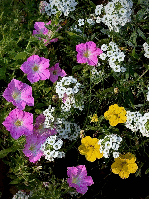 I used a lot of Supertunia Mini Vista Yellow petunias in combination pots with Snow Princess sweet alyssum. These combos are wonderful and like a soft triadic or three-part harmony.