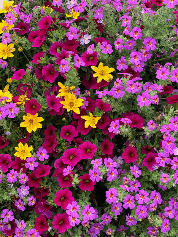 Hopefully you will get to see the photographs of these mixes but if not know that each basket or container features Superbells, Tropical Sunrise or Cherry Red calibrachoas, Safari Dusk South African phlox, and one yellow flower, Supertunia Saffron Finch petunia or Goldilocks Rocks bidens.
