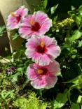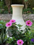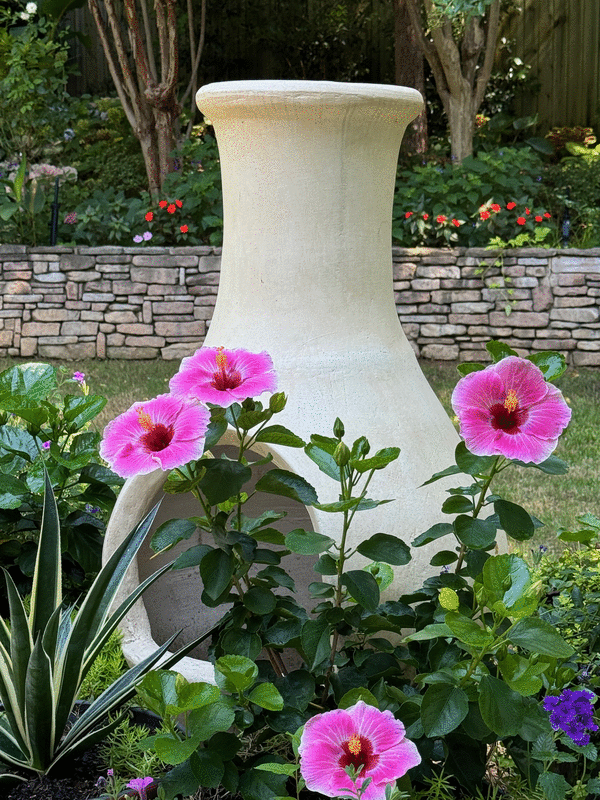 Hollywood Hibiscus America’s Sweetheart is one of the most prolific blooming tropical hibiscuses I have ever grown. The flowers aren’t as large as the VIP and Disco Diva but it is always loaded with blooms. The tag says pale pink edges, medium pink interior and deep magenta throat and that sums it up, other than "drop dead gorgeous." I’ve grown it with Supertunia Mini Vista Plum Veined petunias and Superbena Cobalt verbena, but to see it with my white chiminea may be the ultimate combination.