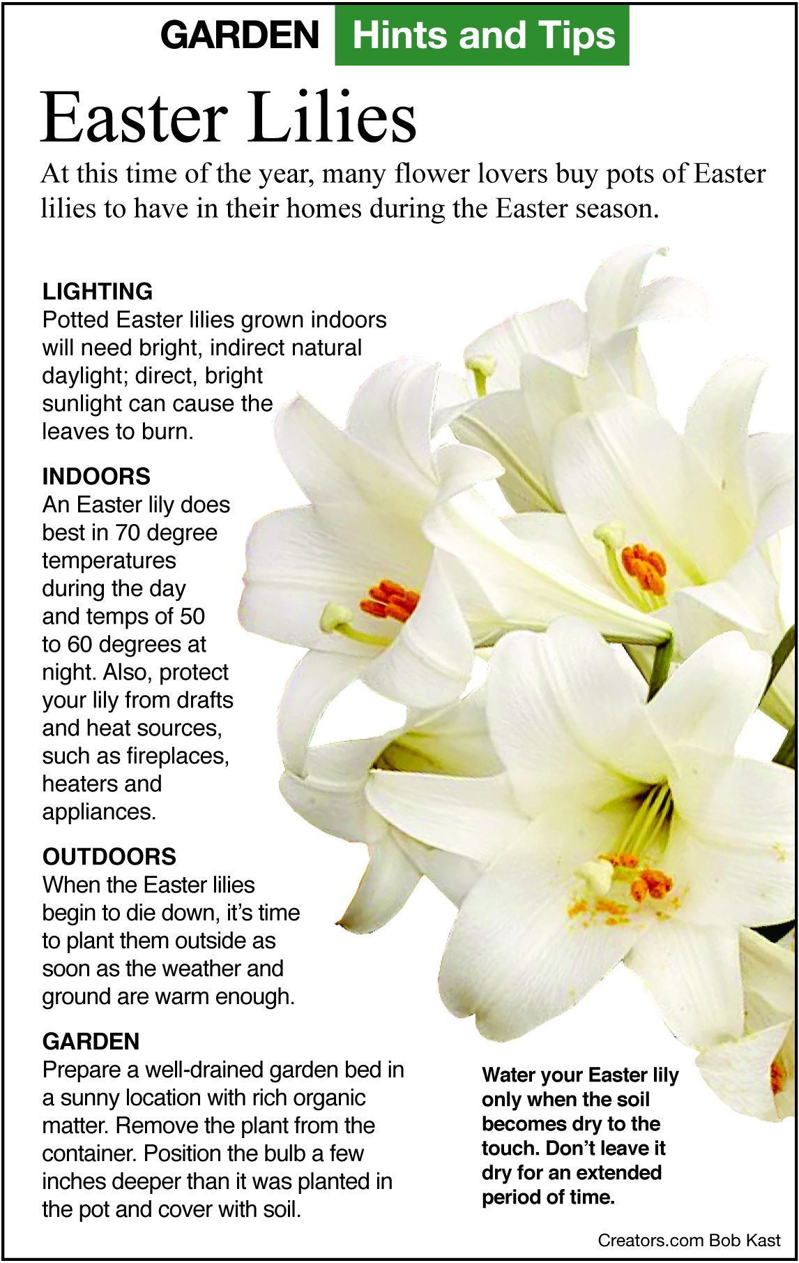 In case you missed it, last Sunday was Easter. You may not celebrate Easter, but you can still pick up an Easter lily at your local garden center. You can call it a spring lily if you want to. They are pretty, and for most people, they have a delightful fragrance. Keep them as a houseplant while the flowers last, and later you can plant them in the garden. The lily will stay blooming longer if you keep the high temperature at about 70 degrees in the day and in the 50-60 degree range at night. This week, you can probably pick up several for the price of what one sold for before Easter.