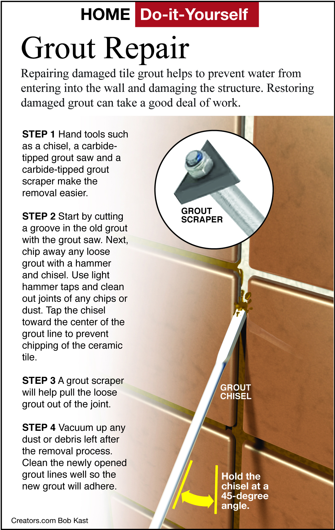 To remove the next spot, chisel in the direction of the last removed area. Continue to work away from the cleared area so the old grout will crumble out.