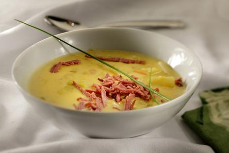 HEARTY POTATO SOUP WITH IRISH CHEDDAR AND CORNED BEEF