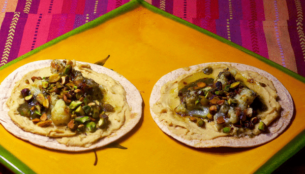 To buy: 6 ounces cauliflower florets, 1 container hummus, 1 package 5-inch whole wheat tortillas, 1 bottle chimichurri sauce, 1 bag shelled pistachio nuts.