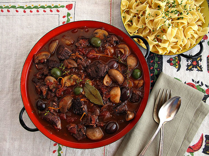 Over a large pot, strain solids from stewing liquid. Reduce cooking liquid by third. Check seasoning. Return beef and vegetables to pan. Add mushrooms and olives and rewarm until hot. Serve with buttered egg noodles and garnish with chopped parsley.