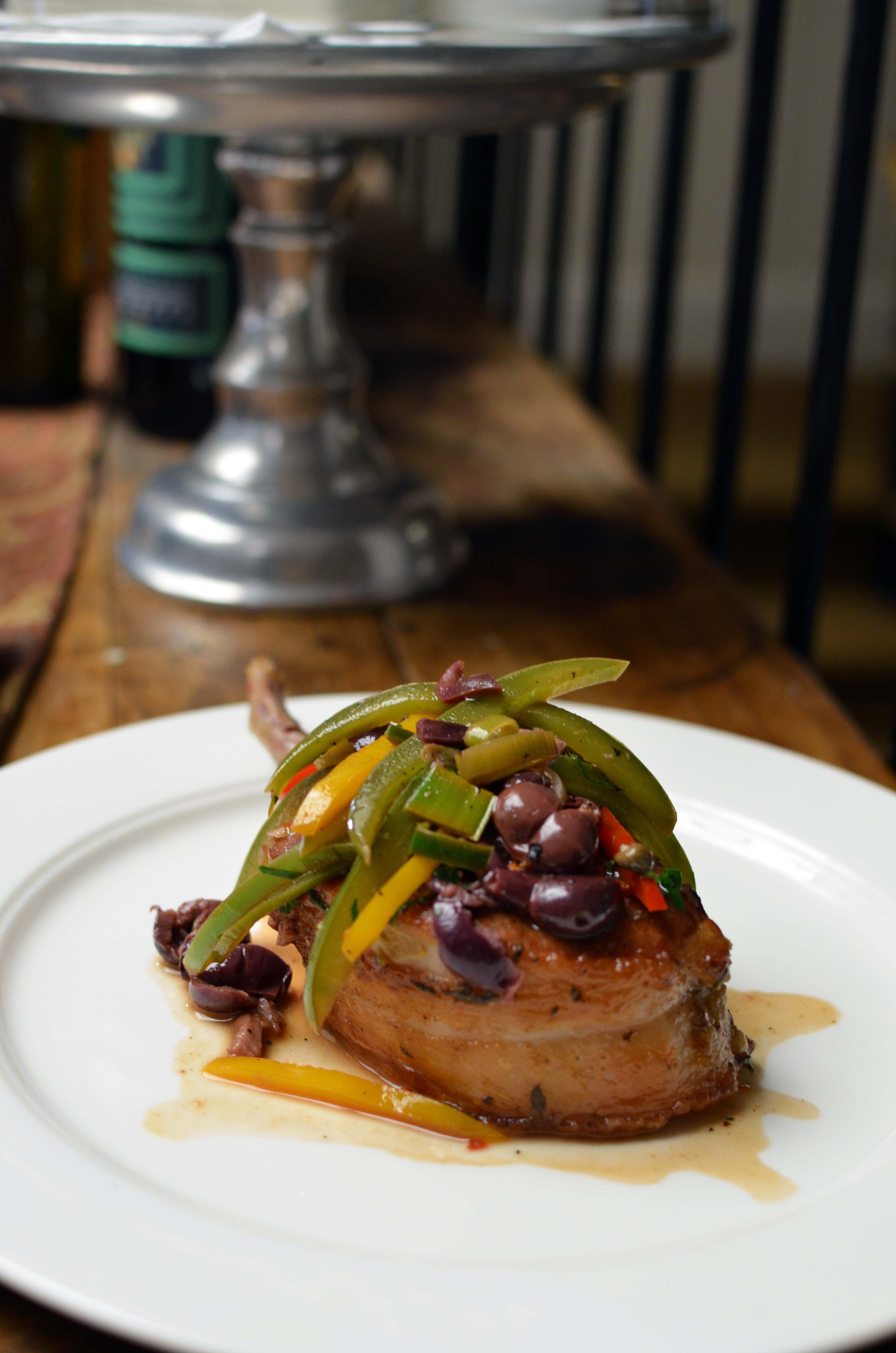 Add the peppers, onion, olives, red pepper flakes and capers, and stir with a wooden spoon to loosen the brown bits from the bottom of the pan. Add the wine and bring to a boil. Lower the heat, place the pork chops in the pepper mixture, and simmer for 10 minutes (the pork should be cooked to 135 F).