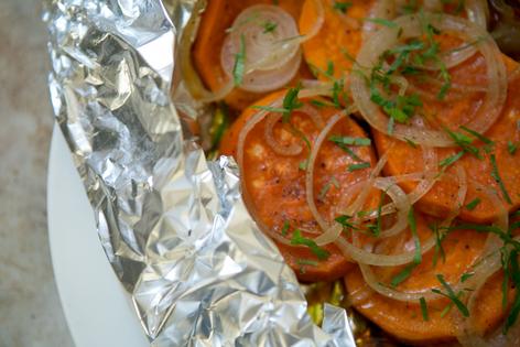 The brown sugar and butter are here in the recipe that follows, but slicing sweet potatoes and cooking them with onions and olive oil in cartoccio -- that is, in a tinfoil pouch -- gives them a whole new lease on life. Thinly slice jalapeno or Serrano peppers and sprinkle on top of the potatoes before serving. The hint of heat will bring out the sweetness of the whole thing.