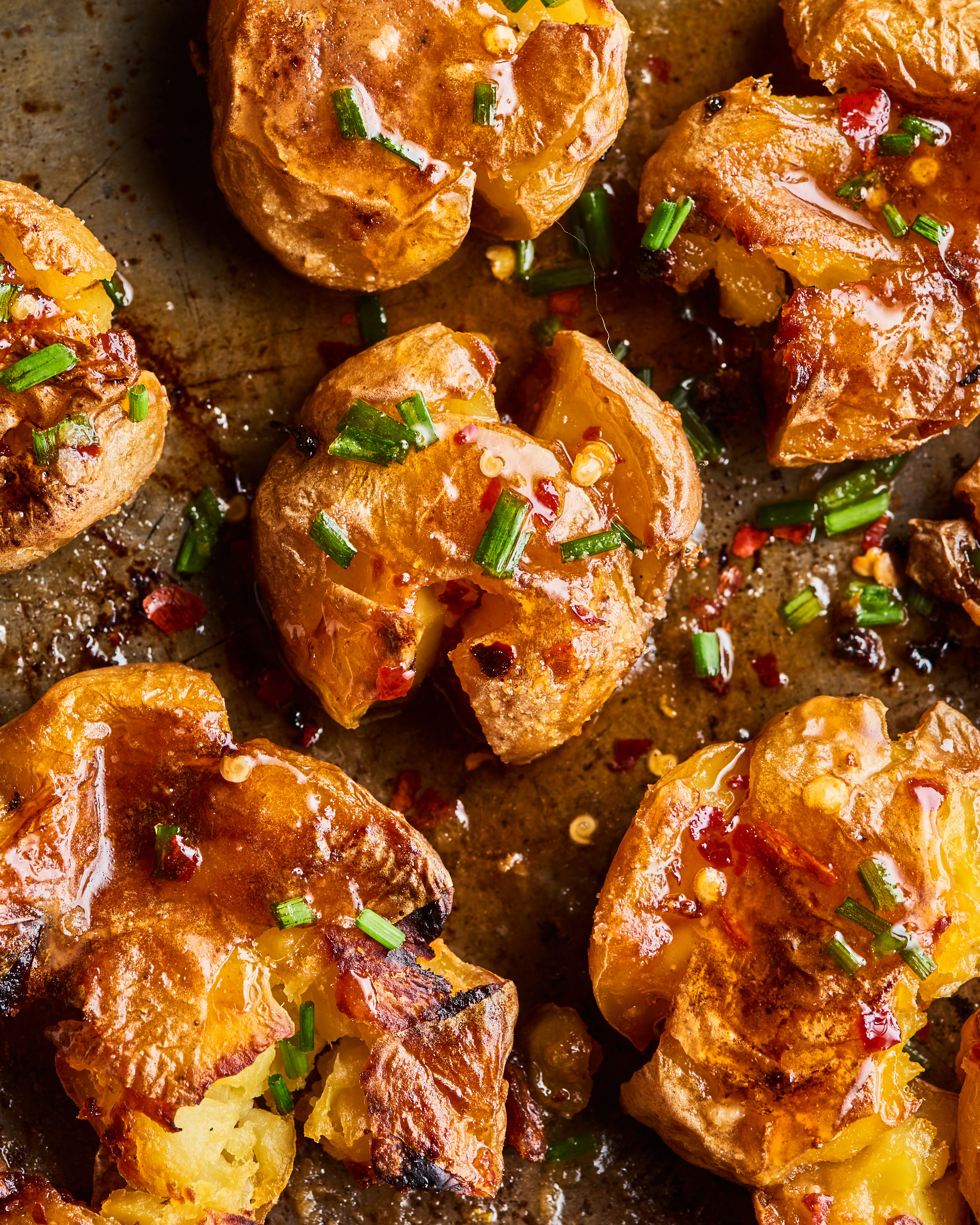 After boiling the potatoes, you toss them in a mixture of melted butter, honey, hot sauce and red pepper flakes; then smash them; roast them; and brush them with more spicy butter before serving. They taste like a warm, fiery hug, and I guarantee you’ll eat them all straight off the sheet pan.