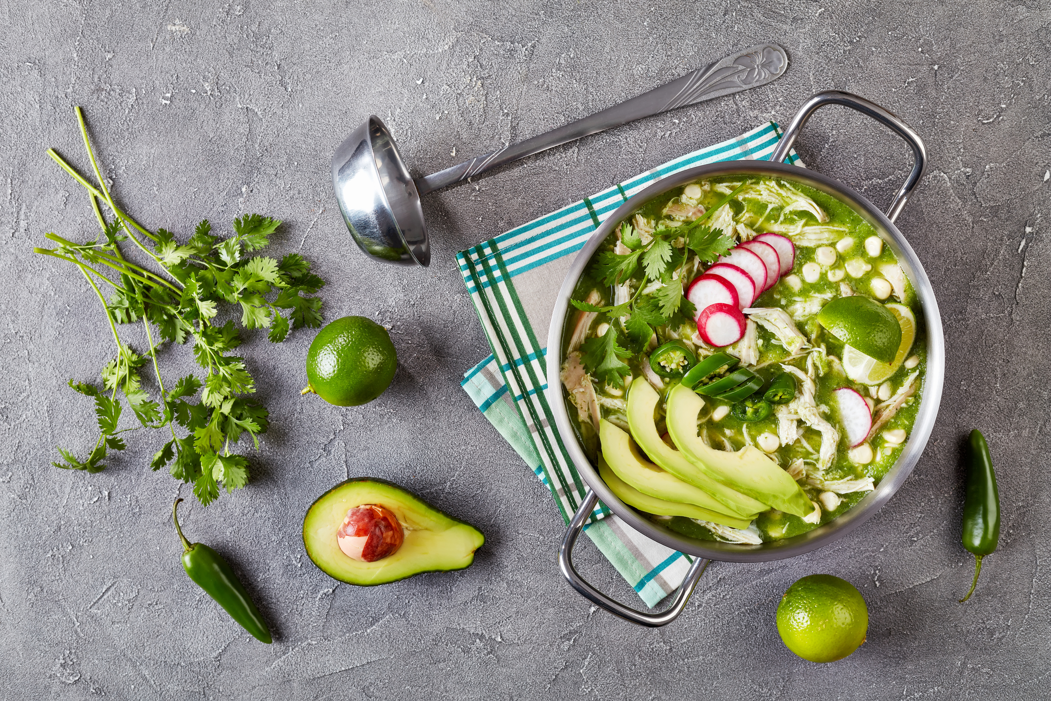 Loaded with flavor from the spices and hominy, this variation of pozole becomes a meal-in-one stew with chicken thighs standing in for pork. And I so enjoy the colorful melange of textures and flavors of this crowd-pleasing Mexican-style stew.