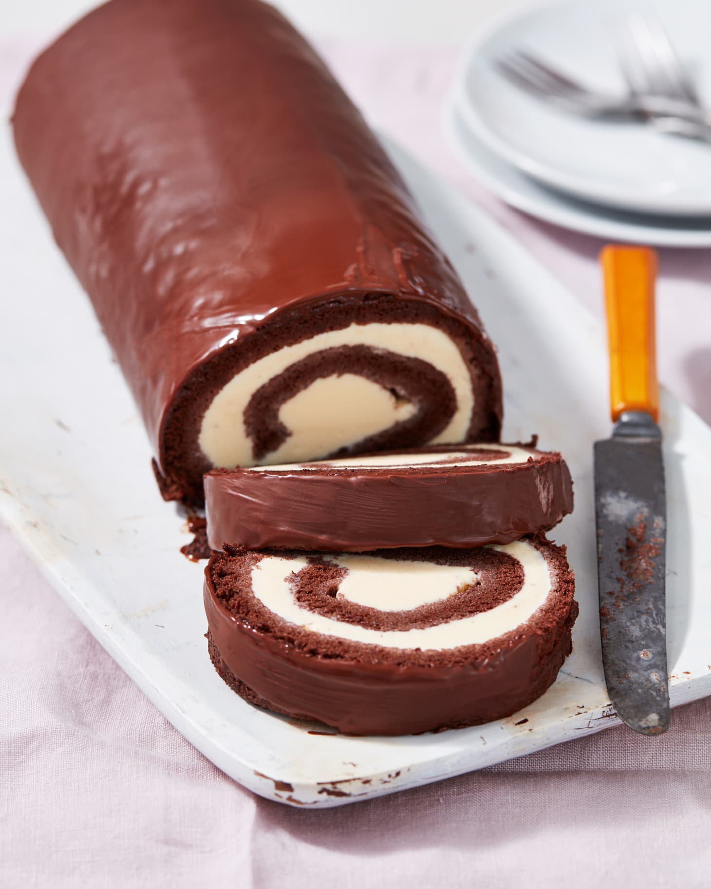 Let the ice cream soften on the counter while the cake is cooling, then carefully unroll the cake and gently spread on the ice cream using an offset spatula or a butter knife. Re-roll the cake without the towel and tightly wrap it in plastic wrap, which will help the roll keep its shape. Freeze until the ice cream hardens, at least four hours or up to one week. When you remove the frozen cake, it’s ready to be bathed in chocolate.