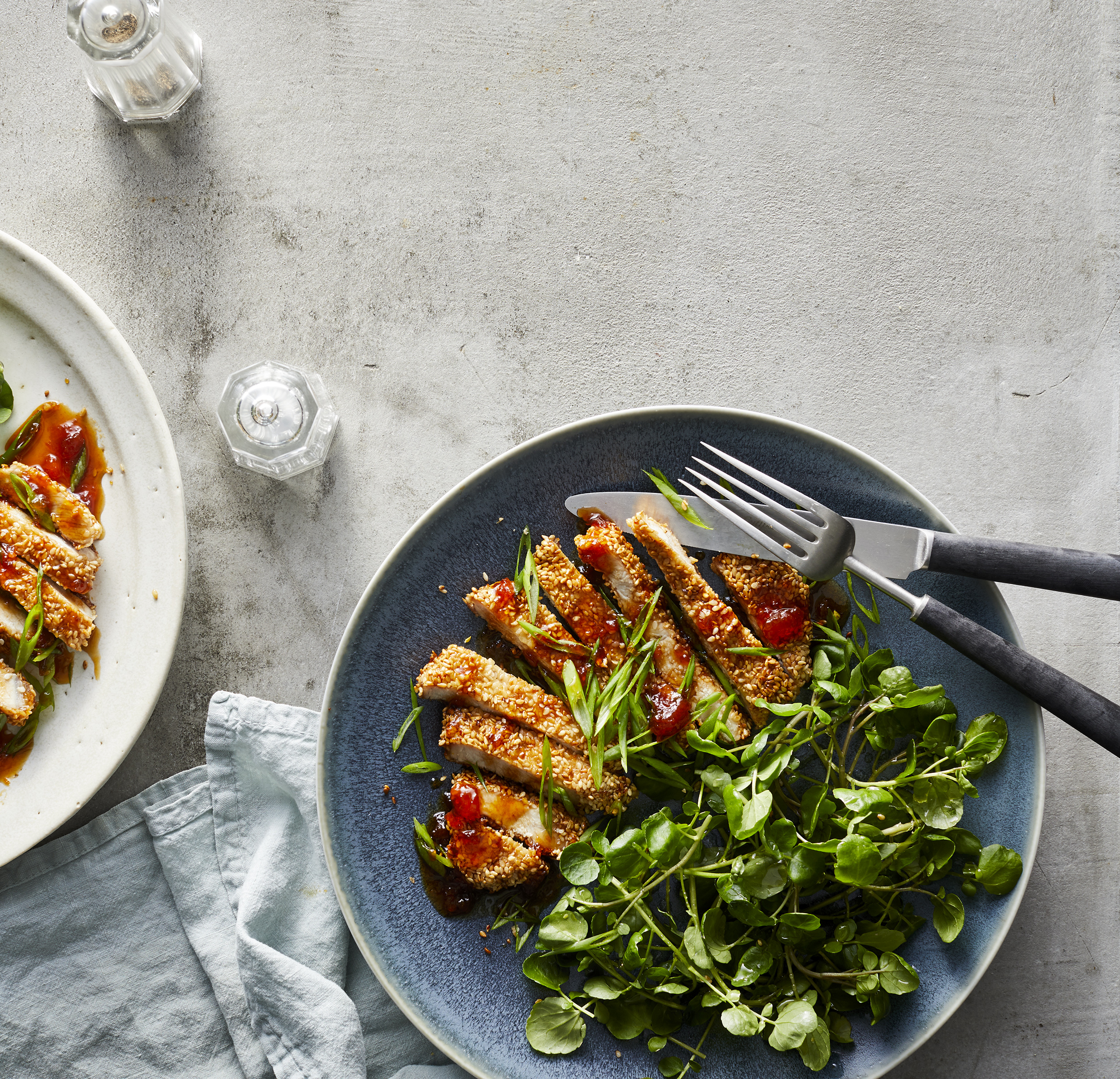 1. Sprinkle pork with salt and white pepper. Place sesame seeds in a shallow dish and dredge the pork in them, pressing to help them adhere.