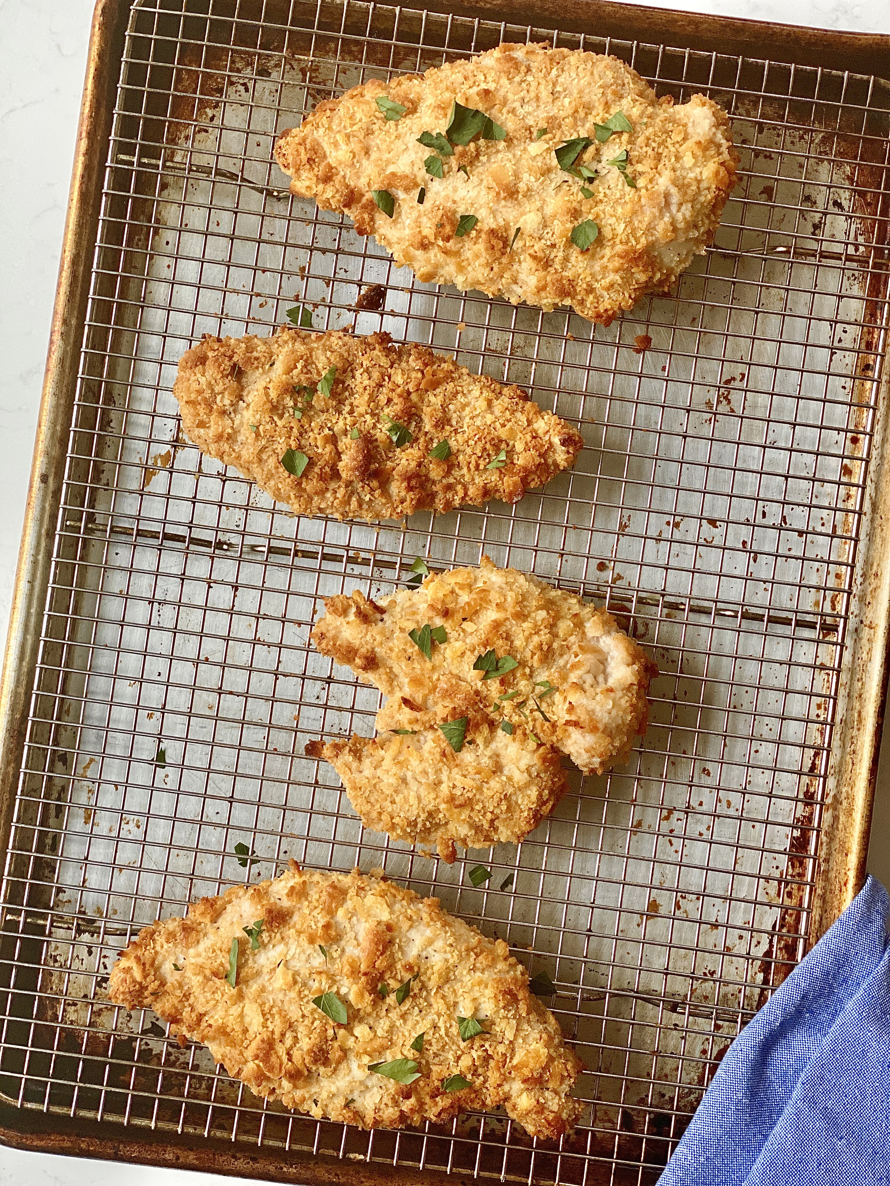 Coating chicken breasts in Ritz crackers imparts every bite with crunchy, buttery flavor. While the recipe calls for Ritz crackers, you can substitute your favorite crushed crackers, chips, or cereal like Cheez-Its, saltines, tortilla chips, and corn flakes cereal.