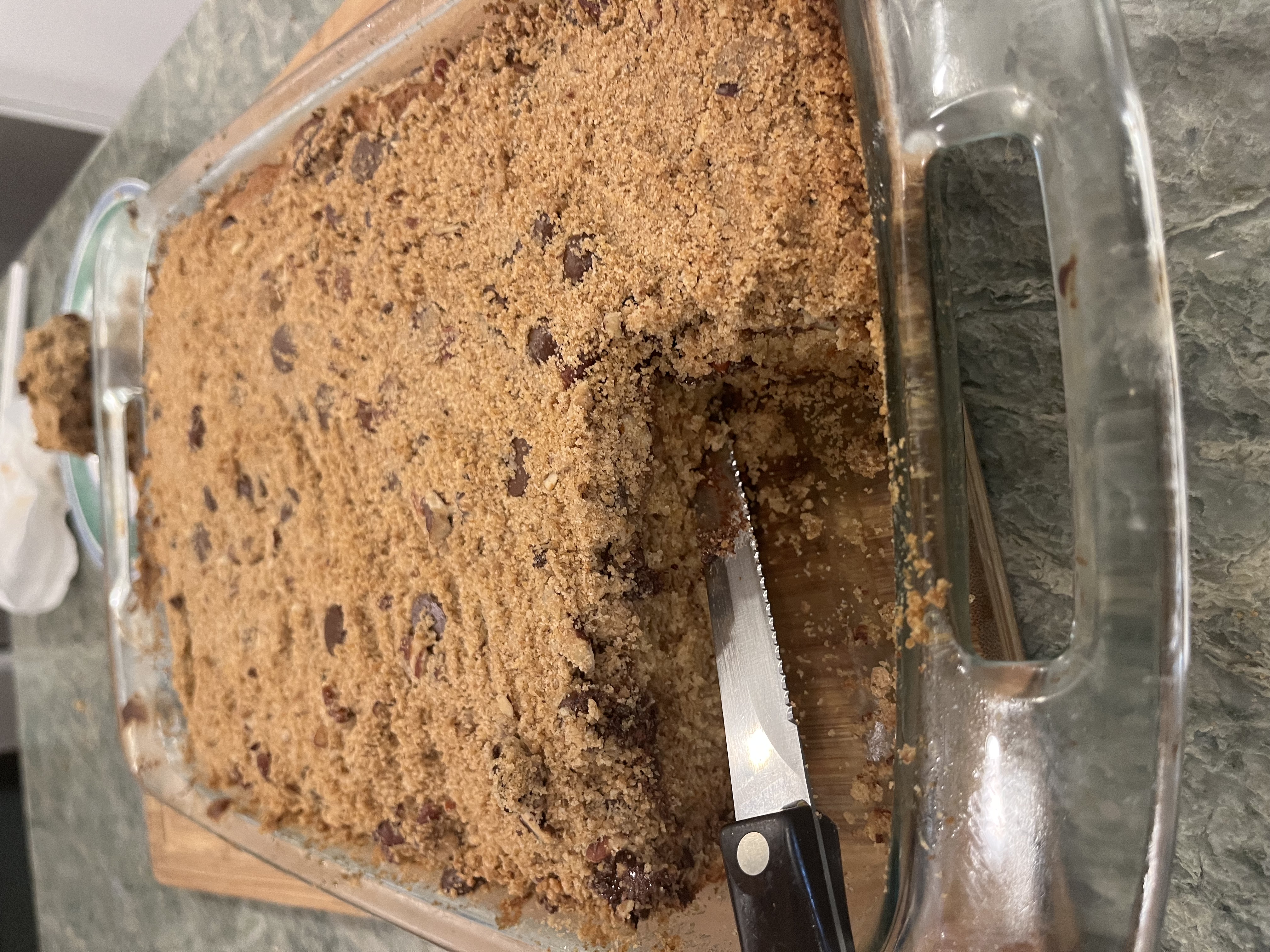 This recipe is baked in a 9-inch-by-13-inch baking pan, so there is plenty for everyone. The old-fashioned crumb topping is a complement to the tender, spiced buttermilk cake layer. I prefer bittersweet chocolate chips, so the topping isn’t too sweet, but feel free to use semi-sweet if you prefer. I also use pumpkin pie seasoning, so it cuts down on time measuring out individual ingredients. This seasoning mix includes cinnamon, ginger, nutmeg and allspice: the aroma of the holidays.